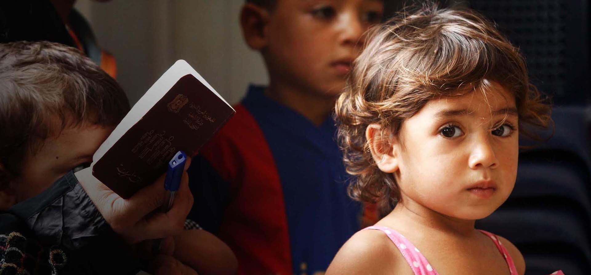 A Syrian family registers with UNHCR after crossing the border near Wadi Khaled, Lebanon.