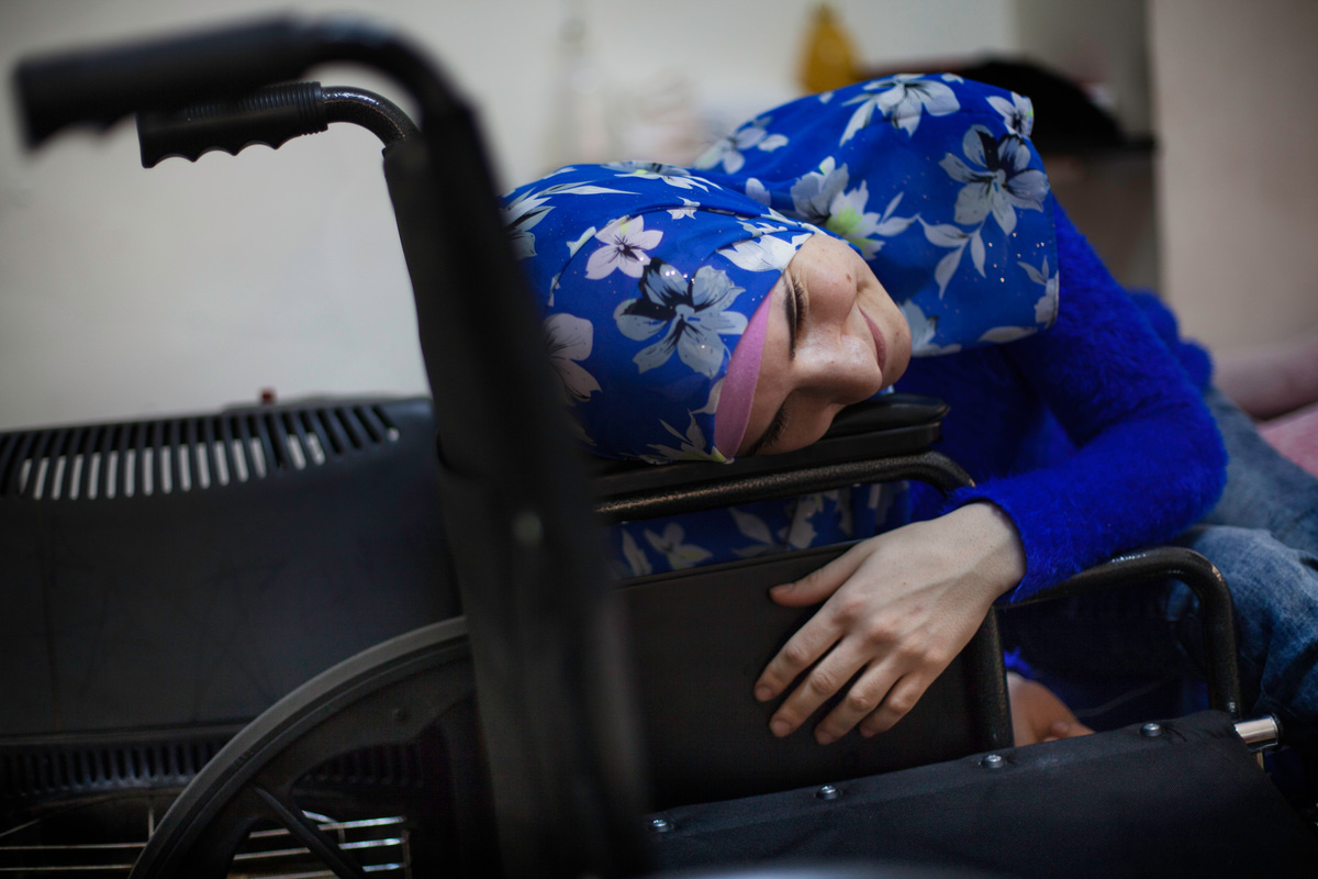 In mid-February, Wisam moved to a rehabilitation centre in Amman that is managed by Syrian-run charity Souriyat Across Borders. She began physiotherapy sessions to rebuild the atrophied muscles in her legs, exhausting herself during exercise sessions lasting up to three hours. “Those first steps were so sweet, but it also shook me to realize just how hard it was going to be to do something as simple as walking.”