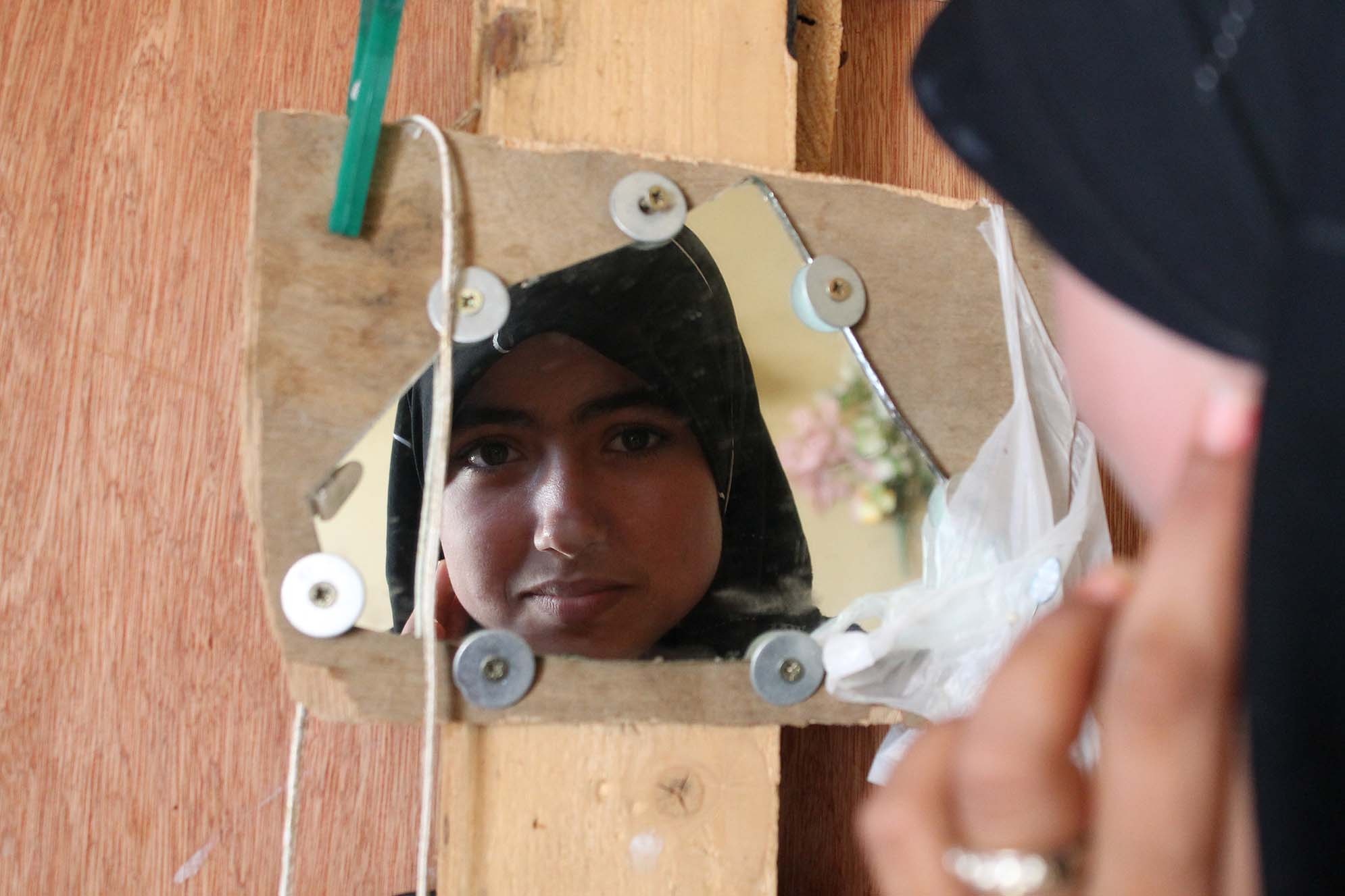 She goes on to explain how hard she begged her parents to buy her a mirror and how, when they declined, she went looking in the fields outside the shelter. It took Alya and her younger brother Mahmoud two weeks to find a broken mirror. Eventually they decorated and mounted it with help from their father. Alya's eyes light up as she shares her success story with me.