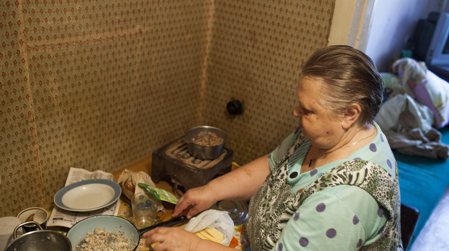 Tamara cooks in the dormitory where she recently started living. She is an internally displaced person in her own town, forced to move three times since her apartment was shelled.