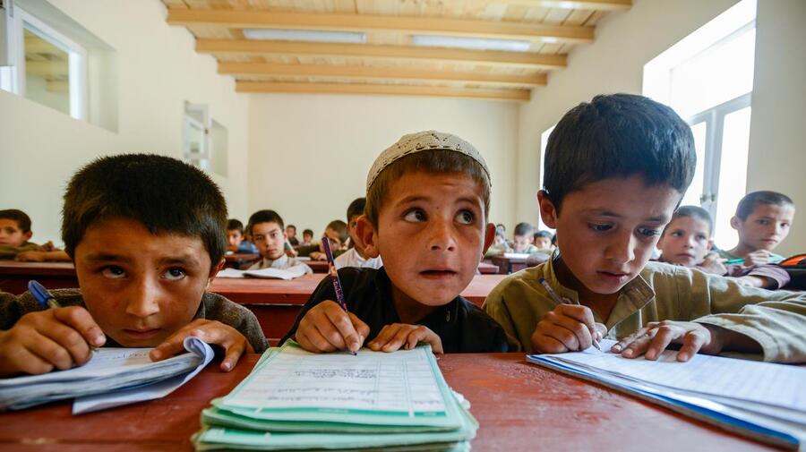 Haqmal (centre), a six year-old returnee from Pakistan loves his new school, the Ansarul-Momineen School in Pajhman, Kabul District Afghanistan.