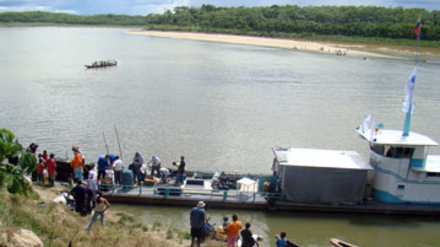 A ferry laden with vital food aid for indigenous people on the Guaviare River.