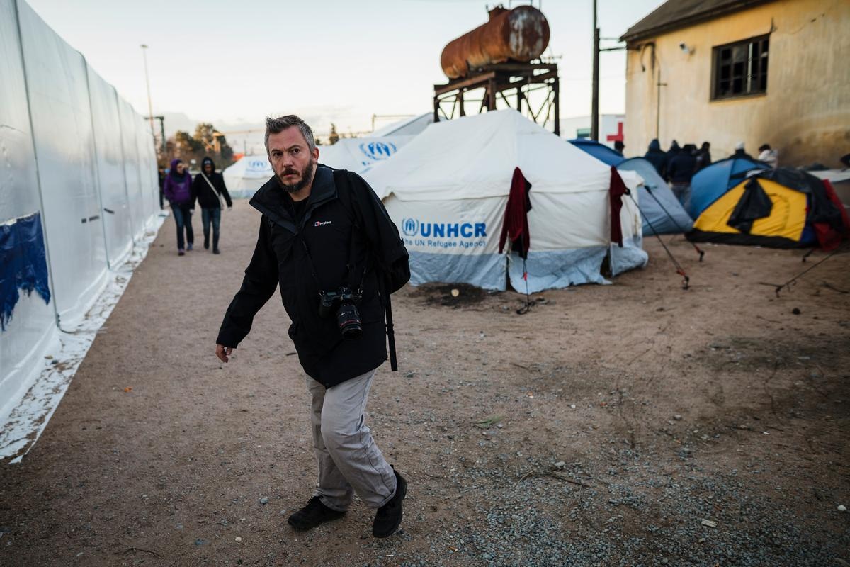 Giles Duley seen in Camp B of the Idomeni transit station.