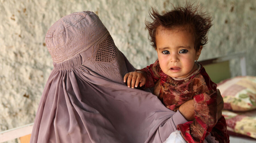 A young mother wearing her burqa holds her daughter. She travelled two days by foot with her family from the Swat valley before reaching safety in camp. The girl has developed skin rash on her hands because of the heat.