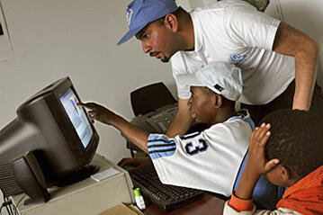 With help from UNHCR staff member Gustavo Valdivieso, Sterlin works on a computer in UNHCR's office. Sterlin’s dream is to work with computers so that he can earn enough to help his grandmother move to a better area.