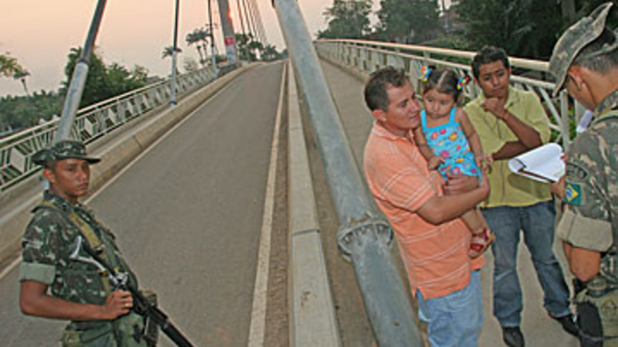The border post at Brasiléia in north-west Brazil. Several hundred Bolivians have fled political instability at home and sought shelter in this part of Brazil.