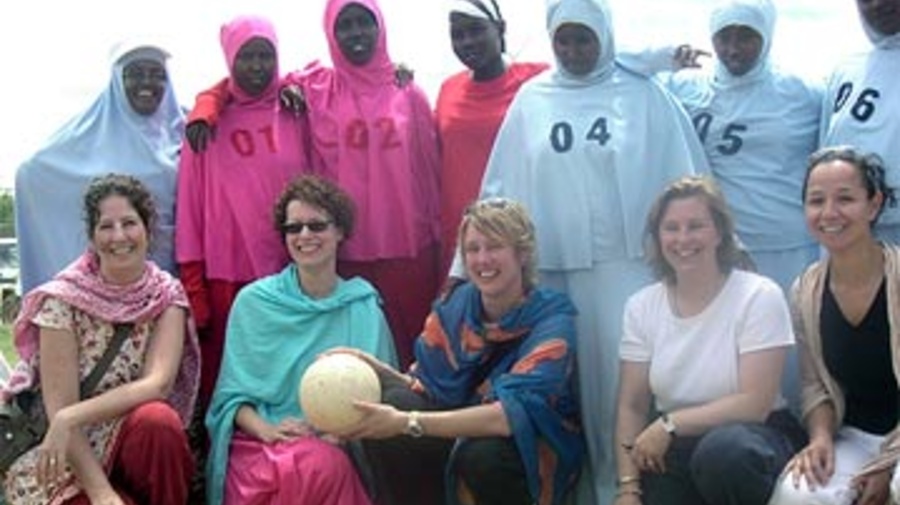 Somali refugee girls in their new sports uniforms, with the Nike design team in Dadaab camp, Kenya.
