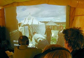 Screening "Sheltered Life", a film about Chechen refugees in Ingushetia's camps, under a UNHCR tent.