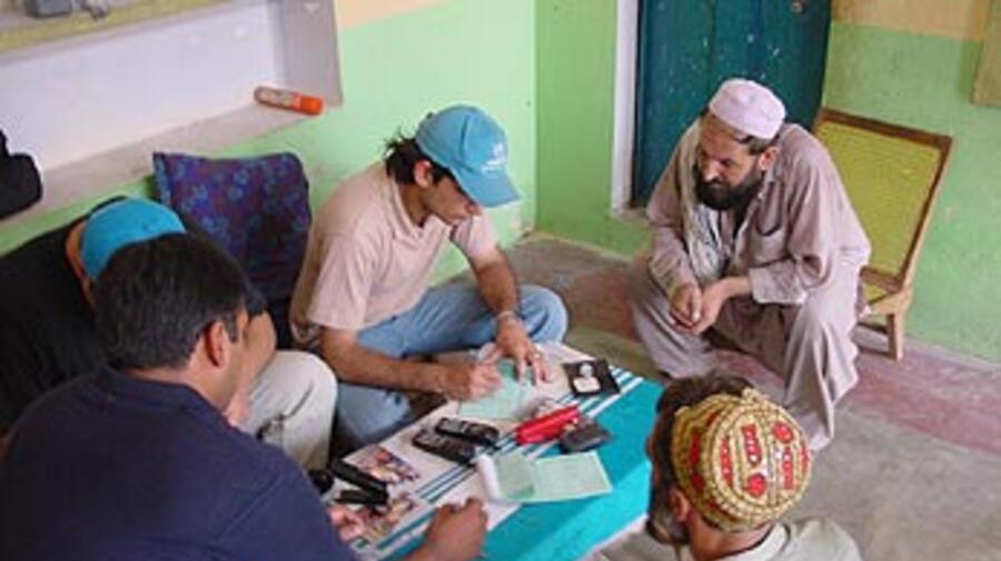 UNHCR teams interview Afghan families in Attock, Pakistan, to determine if they are genuine returnees before handing out slips for travel assistance.