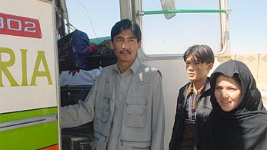 Razia and Hussain Ali (with a young relative) boarding the bus back to Kabul.