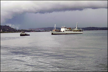 The MV Mwongozo navigates through sand banks off Kalemie during a tropical rainstorm.