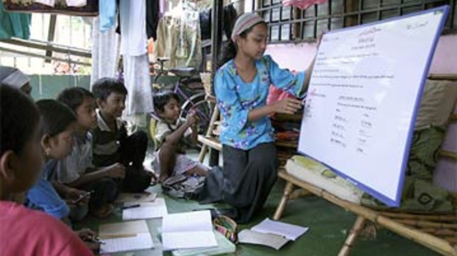 KELANG, Malaysia, July 14 (UNHCR) - On the weather-beaten porch of a small terrace house in the town of Kelang a young Rohingya refugee steps up to a whiteboard, writes a message and reads out what she has written to a group of restless children.