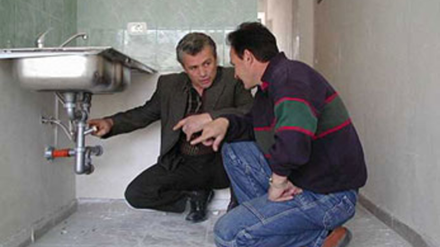 Abedin (right), an asylum seeker from Kosovo, getting professional tips on plumbing in Tirana.