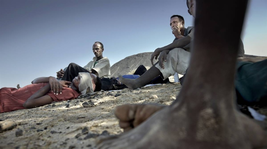 A group of exhausted people shortly after reaching Yemen after a gruelling trip across the Gulf of Aden.