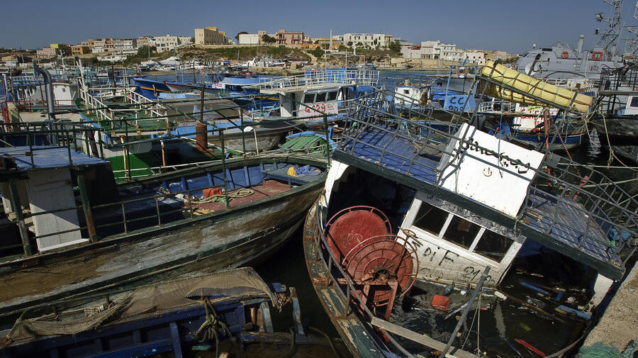 A floating cemetery of smuggler's boats in Lampedusa. These rickety boats were used to transport people fleeing Libya for Italy. Many do not make it this far.