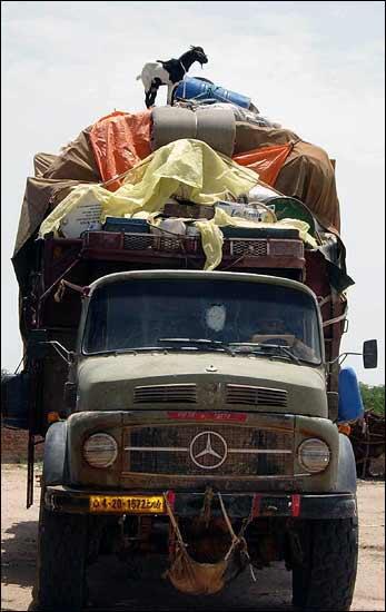 From two of the trucks, the sound of bleating floats down from on high. Perched atop the mounds of relief items stand two goats, looking down at the crowd that has gathered around the convoy. The goats, however, are the only part of the load not destined for the refugees - the convoy personnel had to bring with them everything needed during the journey, including food, and goats are a common source of meat in this region.