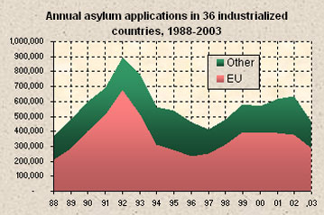 The European Union also recorded record lows in 2003 asylum applications - down 22 percent from the previous year, to 288,000. This was the lowest since 1997, and well under half the record high of 669,000 in 1992, during the Balkan wars. The EU historical comparison did not include Italy as its 2003 figures were not available.