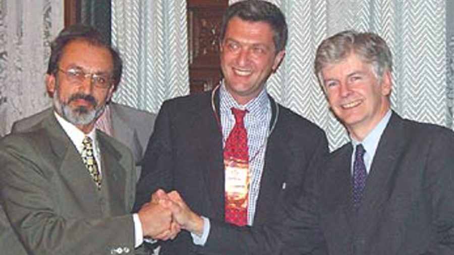 The tripartite agreement on Afghan repatriation signed by (from left) Afghan Minister for Refugees and Repatriation Enayatullah Nazeri, UNHCR's Filippo Grandi and a British Foreign Office minister, Mike O' Brian.