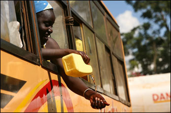 A returnee refreshes herself with water as her bus prepares to cross the Uganda border and arrive in Busia.