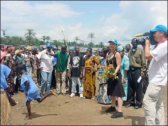 Celebrations in Tobanda camp as German actress Cosma Shiva Hagen and an RTL cameraman look on.