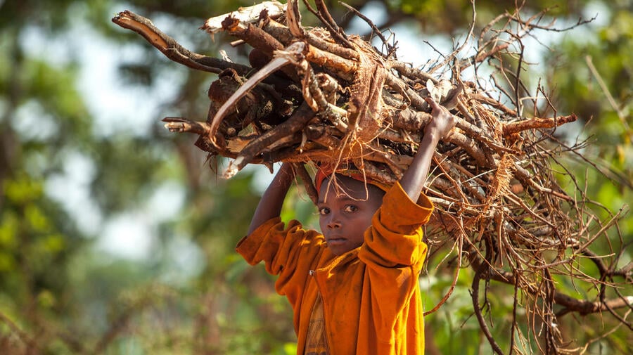 Burundian refugee boy collects firewood outside Nyarugusu Refugee Camp in western Tanzania.