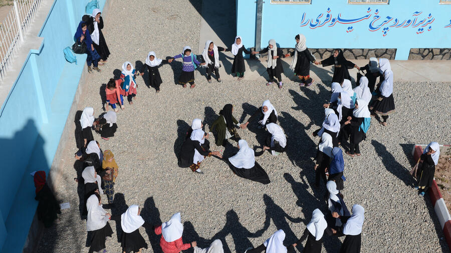 Displaced Afghan schoolgirls play during a break at Kahdistan Secondary School in Injil district of Herat province, Afghanistan, November 2020.