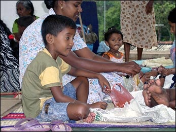 Displaced by the tidal waves, villagers seek shelter in a temporary accommodation centre in Wattala.