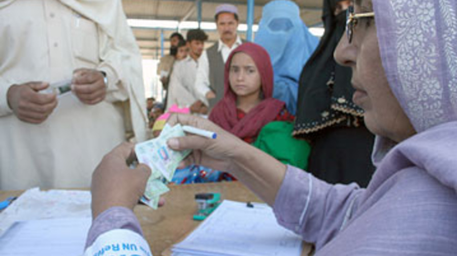 UNHCR staff checking Proof of Registration cards to verify the identity of registered Afghans before they return home from Pakistan.