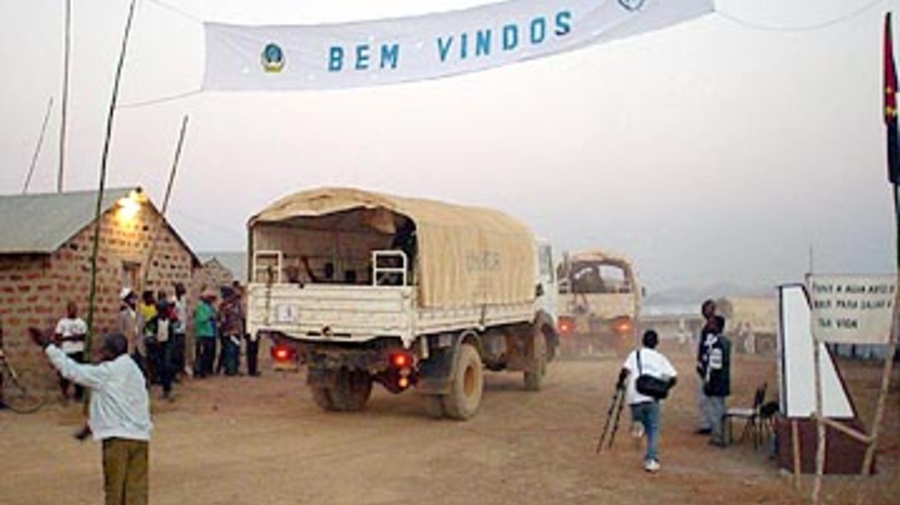A convoy of returning Angolan refugees arrives at the Kiowa reception center.