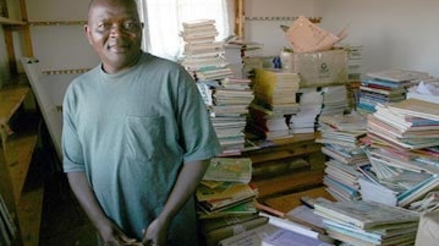 Headmaster Augustine Chipula stands in the library of Umodzi Katubza Primary School, whose students have the best results in the area.