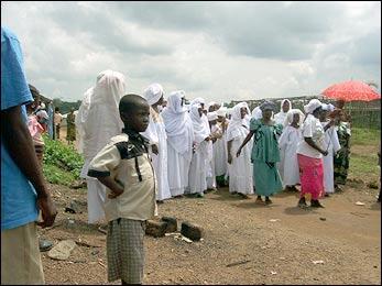 VOINJAMA, Liberia, July 20 (UNHCR) - The sound of drums fills the air from the slender tower of the mosque at the entrance of Bakedu town. Women, men and children stream to the Bakedu Mosque to converge for special prayers marking the beginning of the traditional cleansing ceremony in this hilltop Mandingo chiefdom located some 15 km north-east of Voinjama city in Lofa county, Liberia.