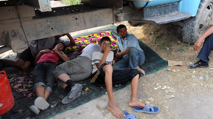 Displaced men in Kyrgyzstan find shelter wherever they can - in their cars, under trucks and out in the open.