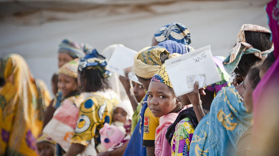 Central African Republic refugees at the Timangolo site in Cameroon, including mothers and young children, queue for food.