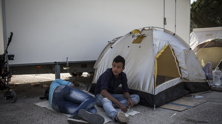 Two boys rest next to their tent outside the screening centre at Moria. Refugees and migrants live in tents until there is space available to accommodate them inside the centre. An education park in Kara Tepe is also being used as temporary accommodation for around 1,000 refugees.