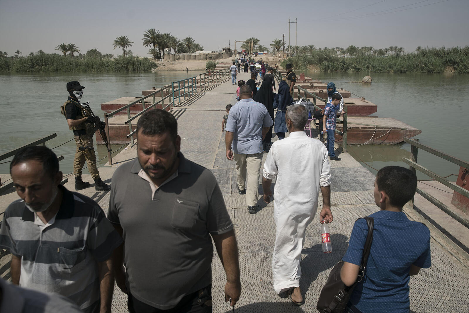 Steady streams of traffic flow in both directions across the floating bridge that spans the Euphrates River near Bzeibiz, Iraq. Young men pushing wheelbarrows full of watermelons, cucumbers and tomatoes weave in and out of families lugging oversized suitcases.