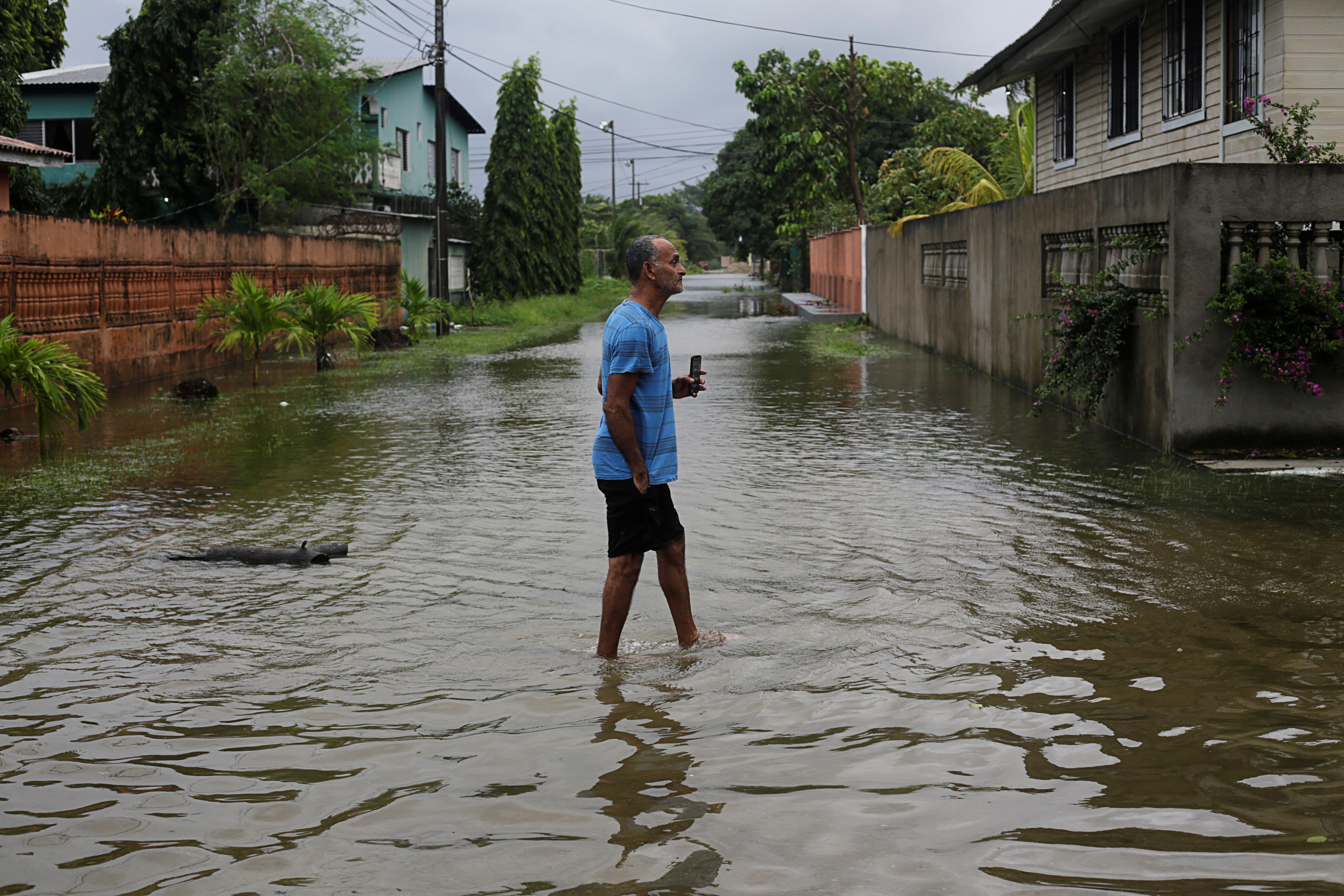 A man walks through a flooded street in Tela, Honduras as Hurricane Eta approaches (3 November, 2020).