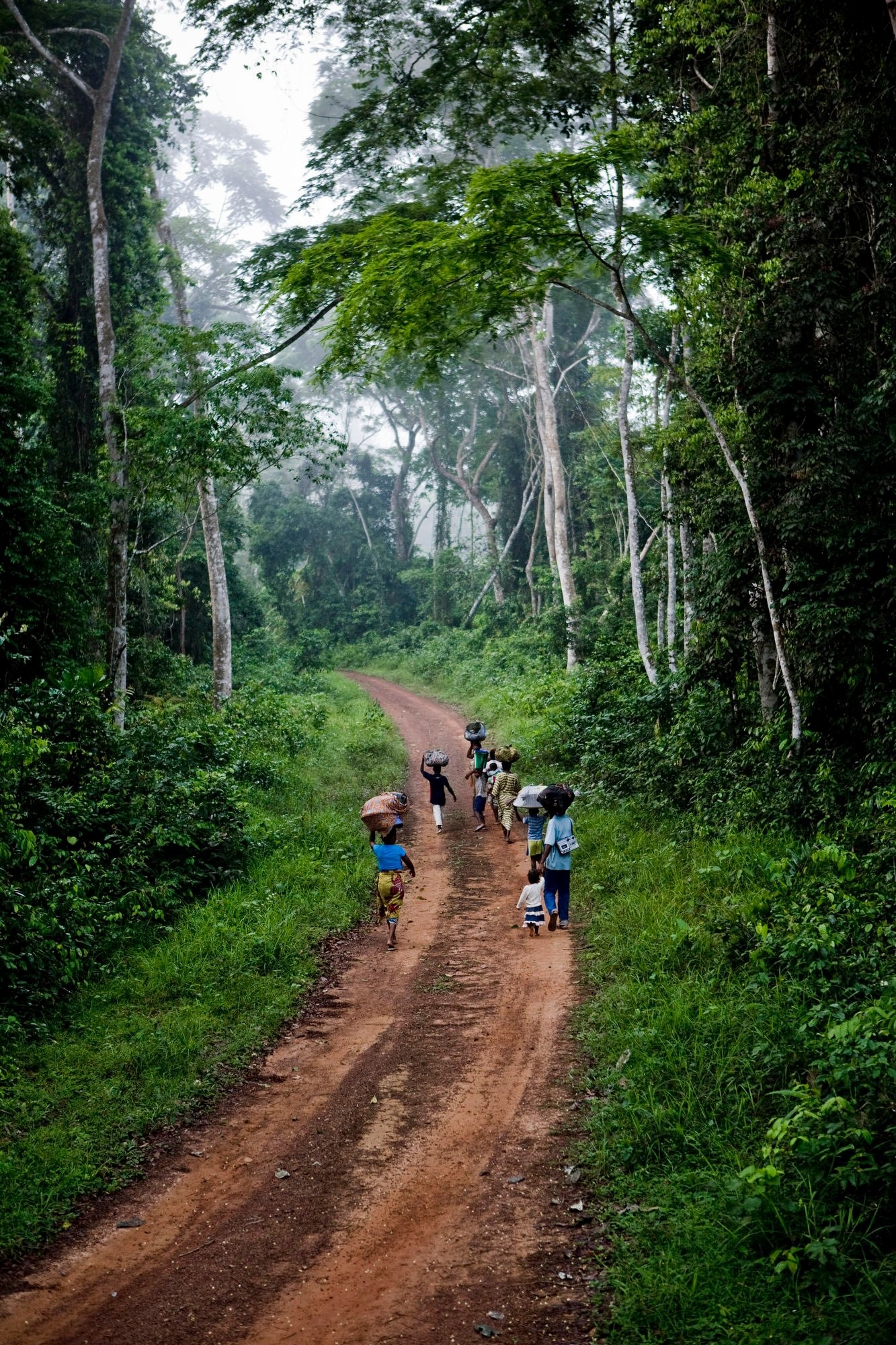A family of Ivorian refugees file along a jungle track towards the town of Zwedru in southern Liberia.