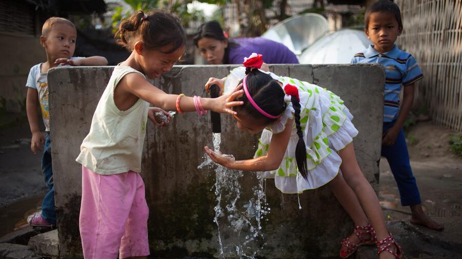 Children play by a water tank in the Beldangi camp in eastern Nepal.