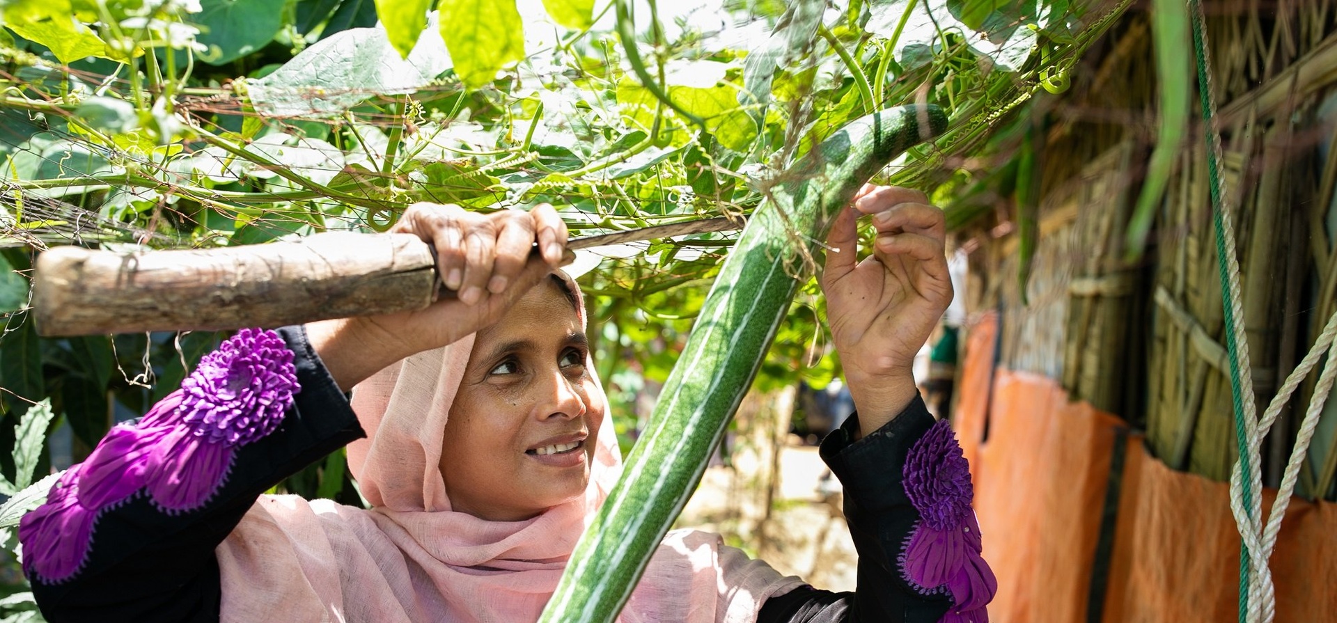 Rohingya refugee Sahera harvests a snake gourd that she grew beside her shelter in Kutupalong, Bangladesh.