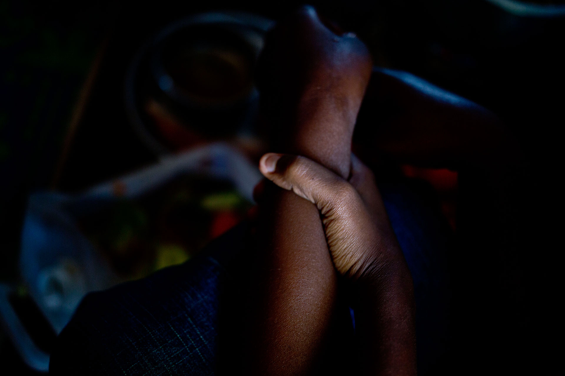 Charles holds his mother's arm soon after their arrival at Rwanda's Bugesera reception centre. They don't want to show their faces because his father and two siblings are still in Burundi.
