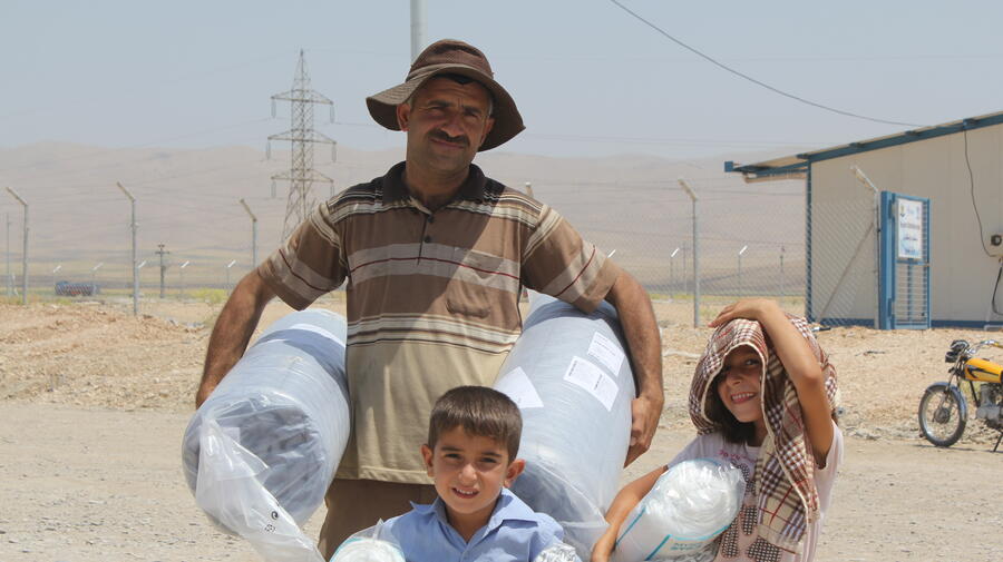 A Syrian father and his sons in northern Iraq carry bedding aid items donated by the IKEA Foundation.