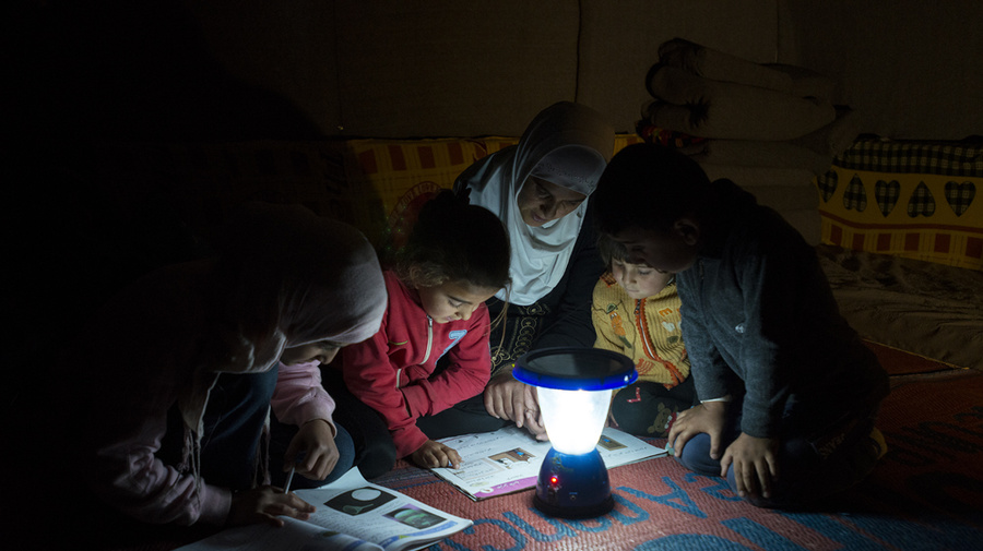 Young Syrians learn by the light of a solar-powered lantern purchased with funds from the IKEA Foundation.