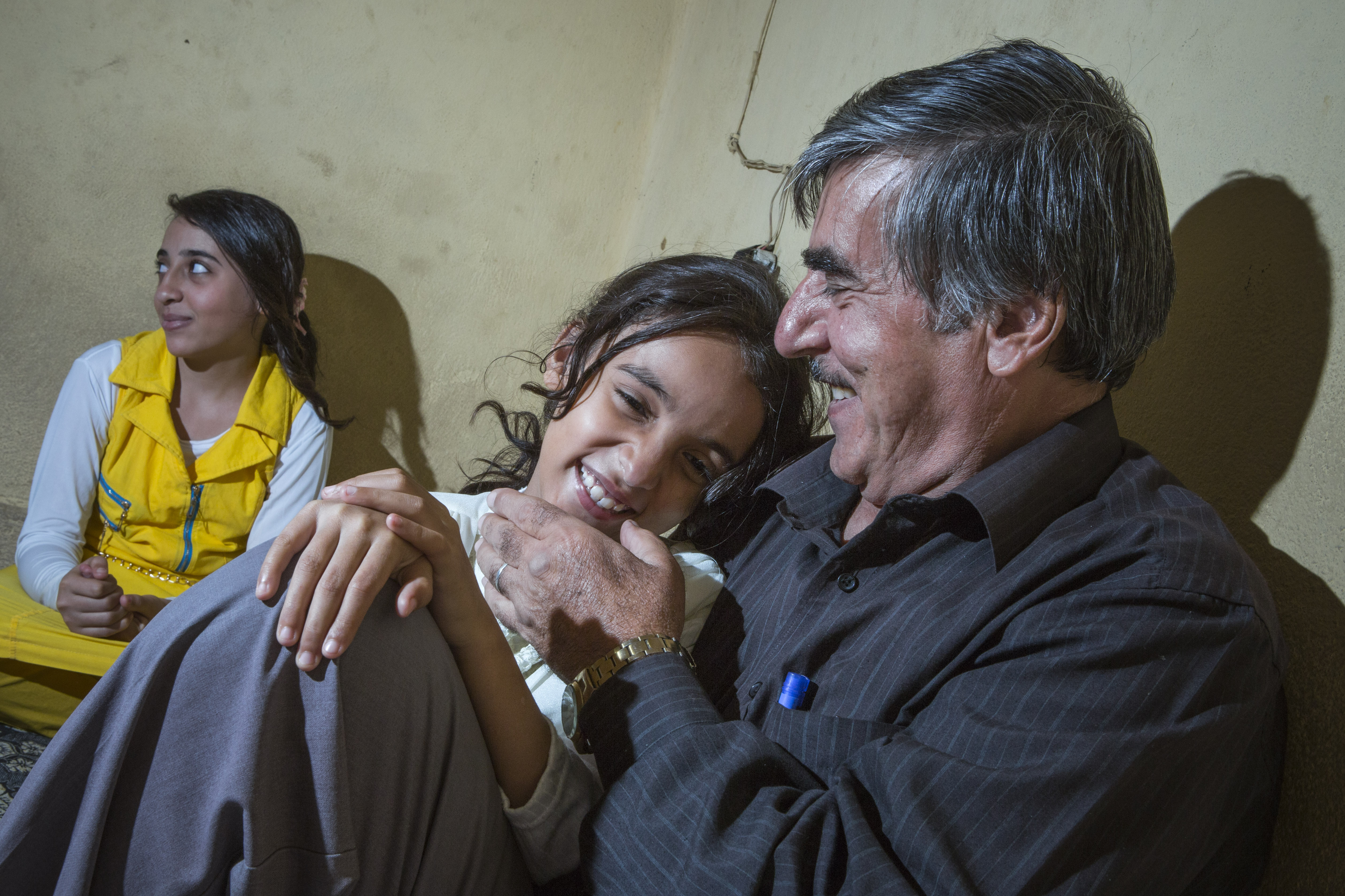 Nora (middle, eight years old) enjoys sitting with her father Husam, right. Far left the sister of Nora, Asmaa (14 years old).