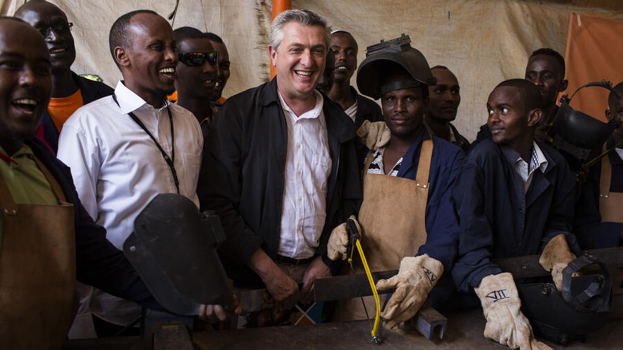 United Nations High Commissioner for Refugees Filippo Grandi talks with a group of Somali refugee welders during a visit to a youth centre at Ifo Camp in Dadaab, Kenya.