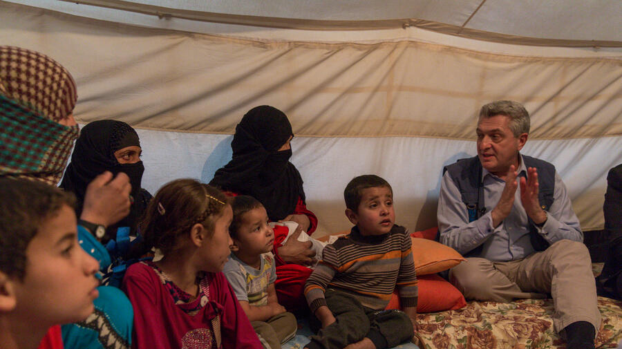 United Nations High Commissioner for Refugees Filippo Grandi speaks with a displaced family in their tent at Debaga camp in the Kurdistan Region of Iraq.