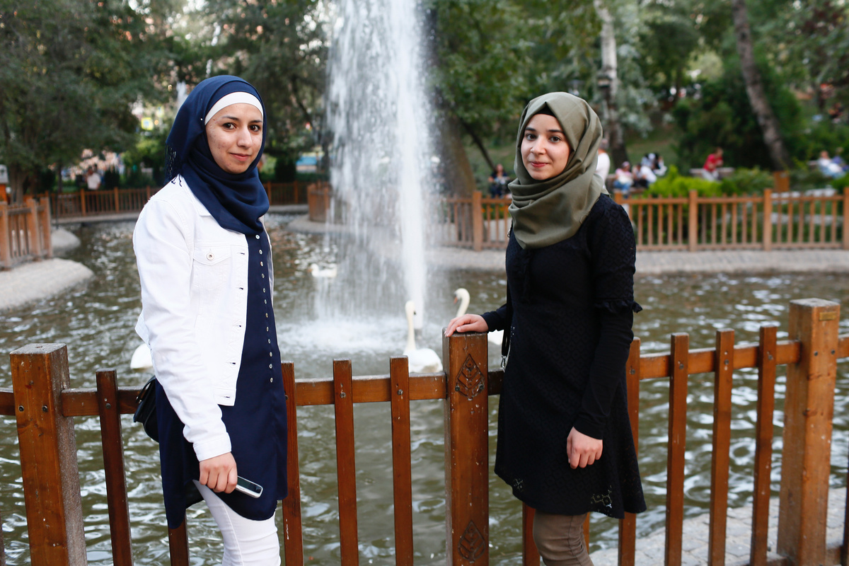 Fatima (right) and her friend Rawan, both 19 from Syria, are photographed on the streets of Ankara after meeting the UN High Commissioner for Refugees, Filippo Grandi.