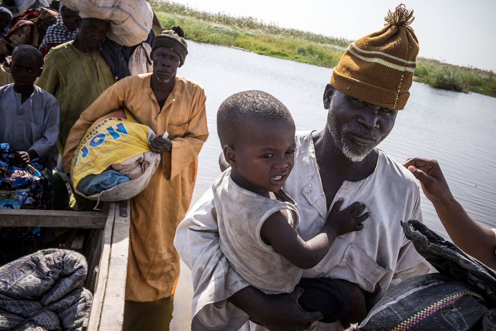 This boat is the last chartered by Chadian authorities and UNHCR to collect some 7,000 survivors scattered over countless islets, patches of sand that appear to have crumbled away from the mainland, much like icebergs released from a glacier. Conditions there are precarious, and many refugees only survive with the help of a few local residents. Their relocation to Dar-es-Salam, a site planted in an arid scrubland 75 kilometres from the Nigerian border, is an urgent, but challenging, humanitarian priority.