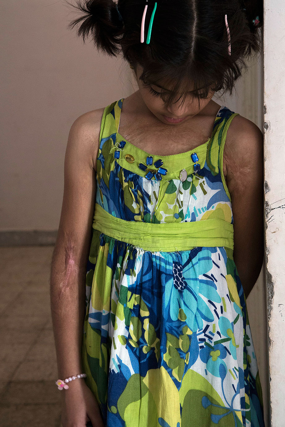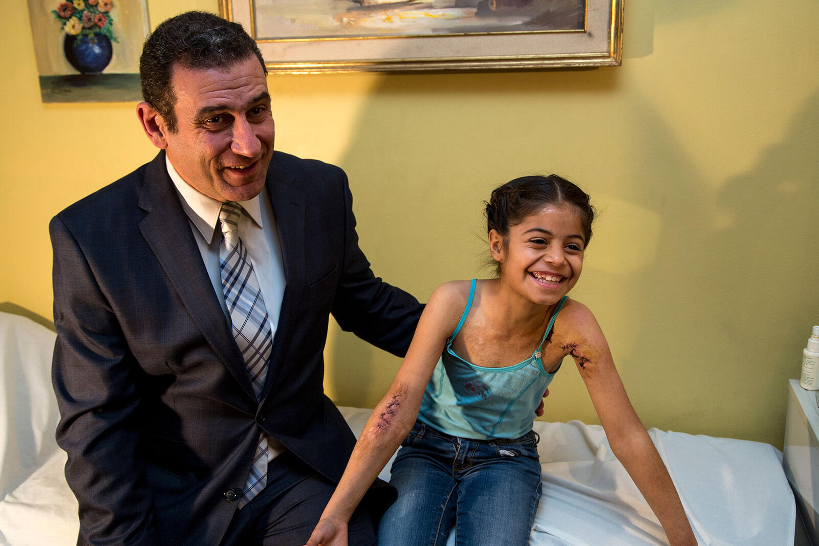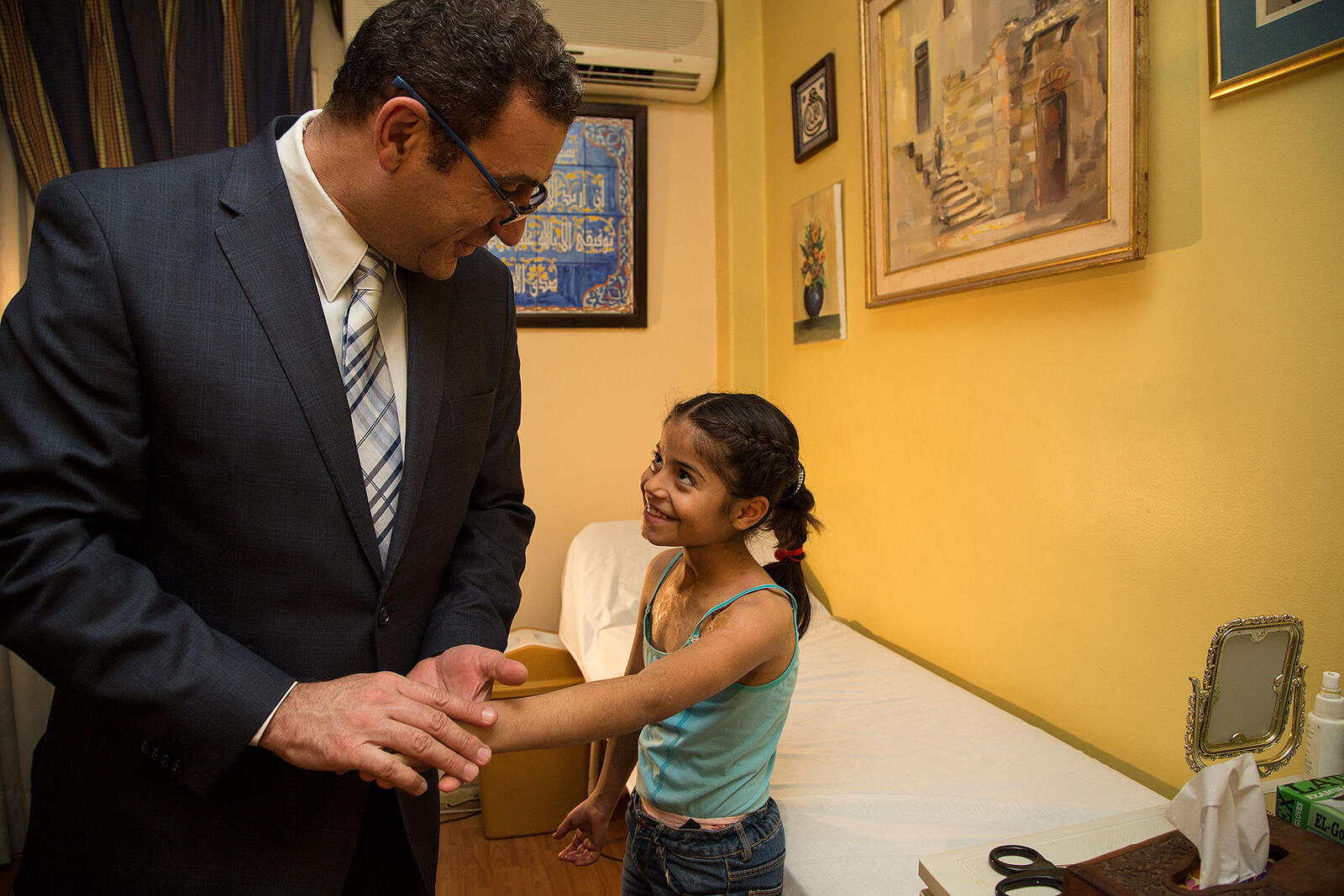 The young refugee suffered the debilitating injury in Damascus not long after the Syria crisis erupted in March 2011. She was playing in the kitchen when an explosion rocked the family home and knocked a pot of boiling water off the stove and all over her arm.
