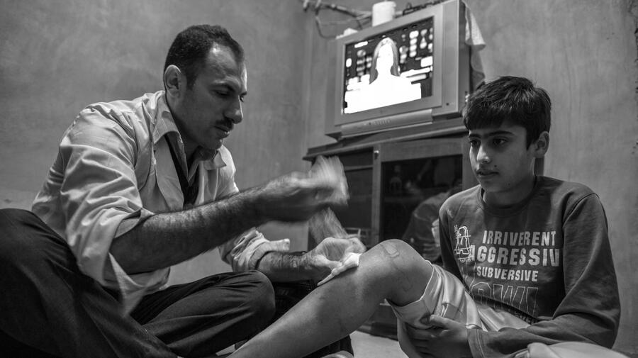 After completing his shift at the clinic in Domiz, Dr Hassan visits a nearby tent and examines a Syrian boy.