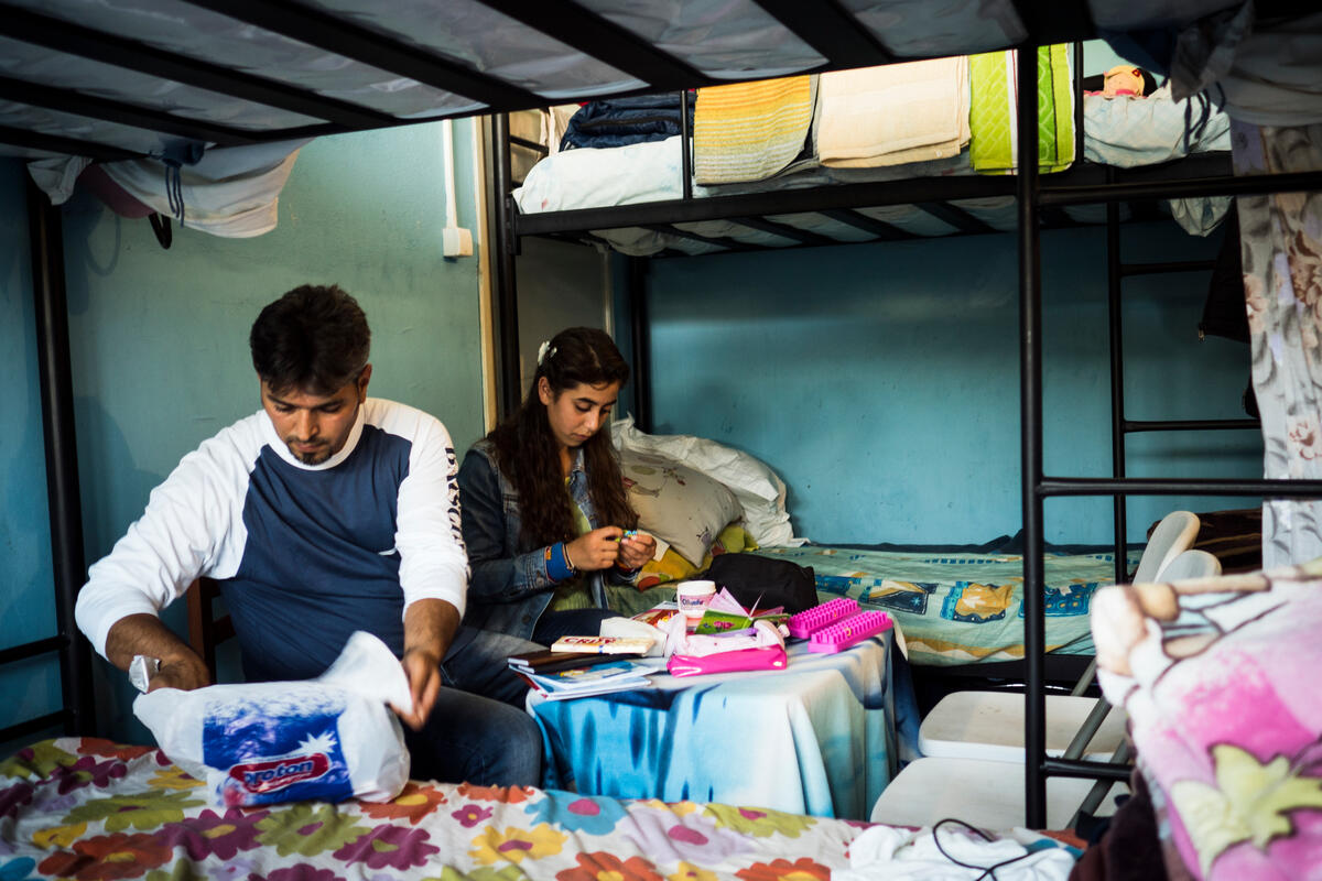 Ensaf and Bashar sleep in bunk beds in a room shared with three other families. Grey thermal blankets hang between the beds for privacy. Three days a week, Ensaf attends free English-language lessons. She dreams of becoming a paediatrician one day – "so I can help people," she says.